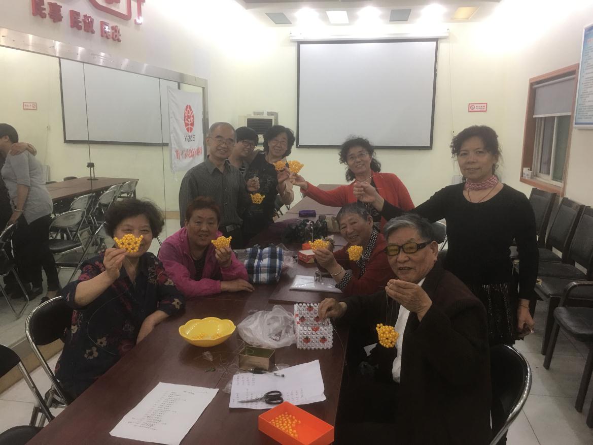 一上课,大家纷纷像社工展示出她们在家与在互助小组完成的作品:纸巾盒。老人们看着自己与组员们的作品,都拍起了自己的手掌,夸奖着对方。在老人们的喜悦中,社工开始教授本节课的学习,元宝。经过前几期的学习,小组成员已经掌握了串珠的手法与技巧,在社工讲解了基本步骤后,组员就基本可以看着串珠教程自制自做,在遇到不明白的步骤时向社工询问,现场学习气氛浓厚,组员们都积极主动参与学习。活动的最后,老人们纷纷拿起自己的元宝进行了合照。