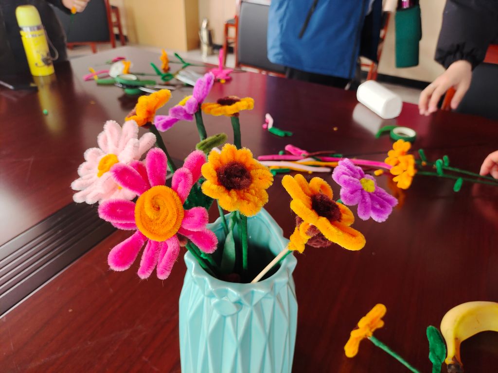 在最后一节小组活动中,社工带领老人们制作扭扭花,通过社工的现场讲解和示范制作,老人们们立即开启了扭扭棒花束的手工制作,他们先是绕出花瓣圈,然后用手指捏出花瓣形状,并用绿色胶带把花朵固定在花枝上,最后装好叶子,社工也在一旁及时为遇到制作困难的老人提供帮助。活动过程中,大家一边做手工,一边相互交流、协作,现场气氛十分活跃。在组员们的共同努力下,一朵朵形态各异的扭扭棒花束便呈现在眼前,老人们看着自己亲手制作的绚烂花朵,纷纷露出满意的笑容。