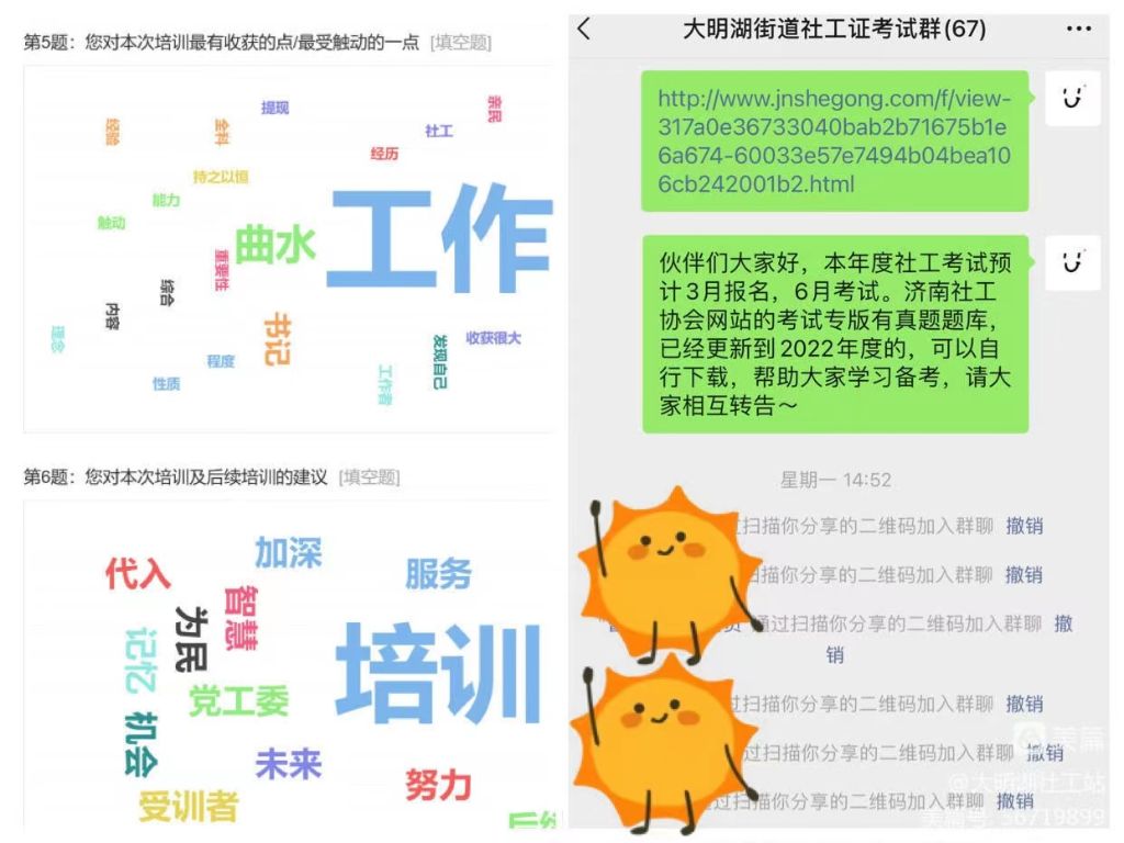 通过政策解读、案例分享、分解任务指标,使各社区明确了培育社区社会组织的意义、培育类型与培育方式,也让各社区充分明晰了培育任务。同时新邀请到27名社区工作者进入“大明湖街道社工证考试群”。培训后,社工站从培训内容、讲师等方面的满意度,培训效果前后测,后续培训需求及建议等方面邀请参训人员进行填写《大明湖街道社区工作者培训反馈表》。据调研,社工考试技巧及知识学习、一老一小群体服务技巧等后续培训方向需求度较大。