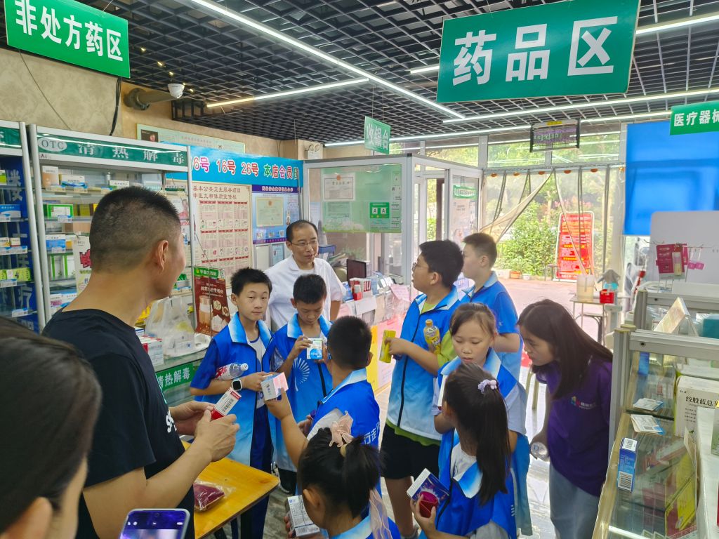 青少年与社工和网格员进行药品安全检查