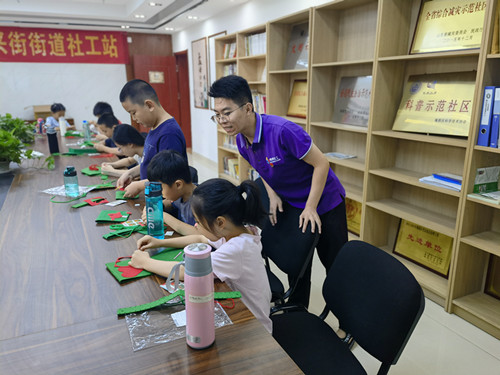 7月8日上午,振兴街街道社工站“彩虹童年”夏令营举办了开营活动。活动中,社会工作者通过简单有趣的破冰游戏,打破青少年与社会工作者及其彼此之间的陌生感,为他们构建更加友好、融洽的朋辈关系。随后,在社会工作者的带领下,孩子们一起制作了不织布手工DIY红军背包。活动结束后,社会工作者还和青少年一起参观了科普馆,共同探讨宇宙的奥秘。