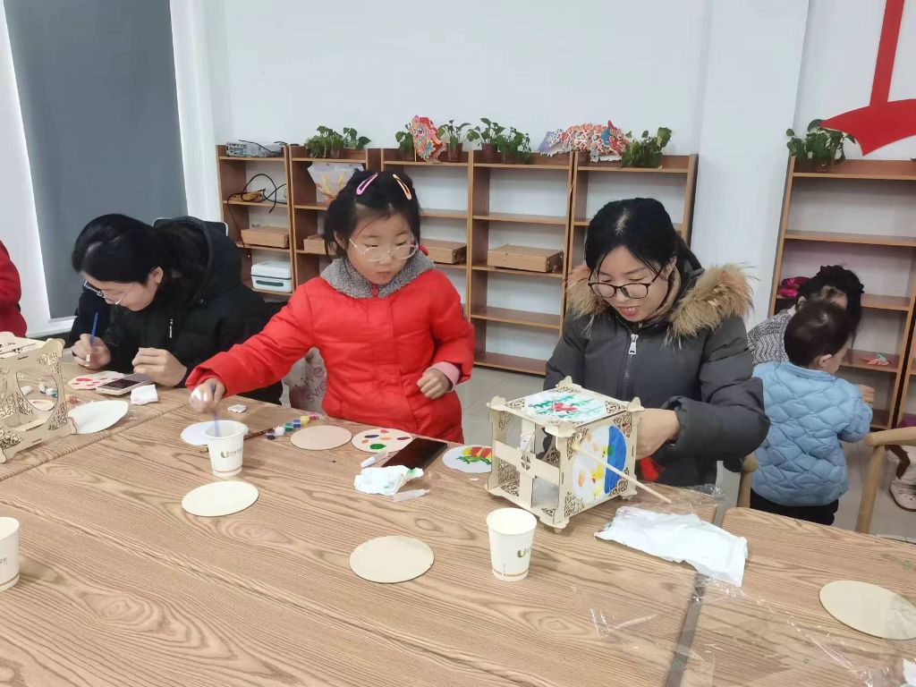 伴随着欢声笑语,手工灯笼制作活动也热热闹闹地开始了。小朋友们化身为一个个小小创作家,挥想象力,自由搭配色彩,用颜料在灯罩上作画,兔子、圆月、星空……在各种各样鲜艳的颜色交织下,一盏盏各具特色的花灯诞生了。“这次活动很有意义,孩子们都很喜欢。”居民梁阿姨期待下次还能多多参与各项活动。