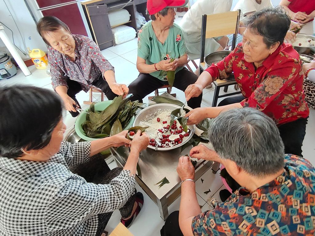 为了让老人们切身感受节日的氛围,颜庄街道社工、志愿者、社区工作人员和老人们一起准备了粽叶、大枣、糯米等食材,一切准备就绪,大家围在一起忙碌起来,不一会儿,一个个形态各异的粽子便呈现出来。