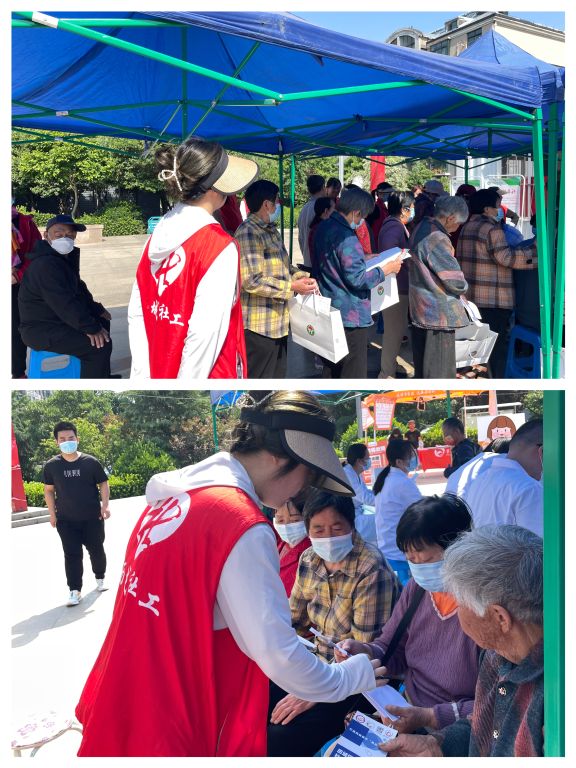 义诊活动开展前,街道社工站提醒老年居民可以携带自身病例或者正在服用的药物前来,以便医生给予更加专业的服务。活动中,义诊现场设置了慢性病科、骨伤科、老年科、口腔科、眼科等老年人需求较高的科室,医生们对每位前来咨询问诊的老年居民进行耐心解答,并根据每个人不同的身体状况,给予科学合理的治疗建议和注意事项,发放相关知识宣传手册及单张,让每位前来就诊的老年居民切实享受到了“家门口”的优质医疗服务。