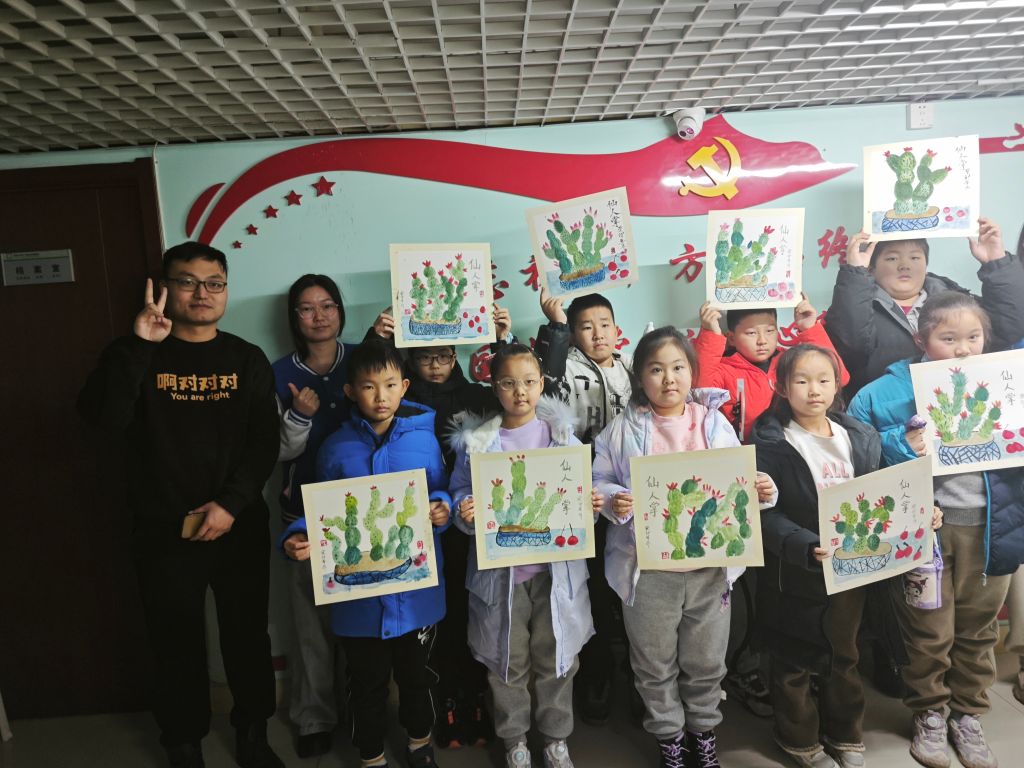 在活动过程中,孩子们逐渐感受到了国画的韵味和魅力,随着时间的推移,一颗颗生动有趣的仙人掌逐渐在孩子们的笔下呈现出来。尽管他们的作品还显得有些生涩和不成熟,但这些稚嫩的作品却充满了童真。孩子们用画笔表达着自己对国画的理解和感受,展现出了无限的潜力。