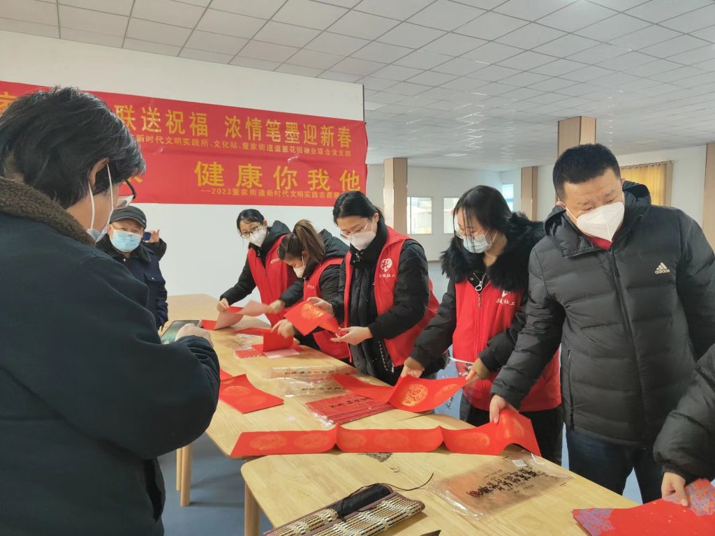 兔年将至,春节的仪式感要从一副春联开始。春联,是中华民族传统文化的瑰宝,是中国人对生活最纸短情长的告白。当人们在自家家门口贴上新春联,也就意味着正式拉开了“过年”的序幕。为了丰富和满足辖区内广大群众文化精神需求,营造欢乐祥和的节日氛围,1月11日,董家街道社工站联合新时代文明实践所,邀请到董家文化站书法老师及辖区书法爱好者开展“福进万家”——写福字迎新年活动,为辖区居民送上春联和新春祝愿,共筑和谐邻里情。