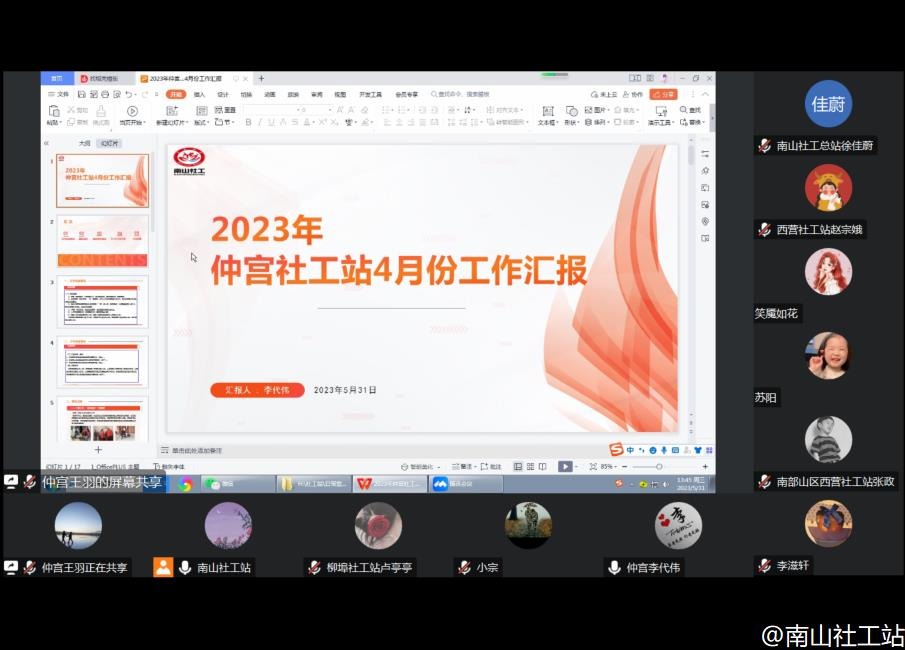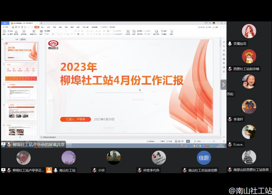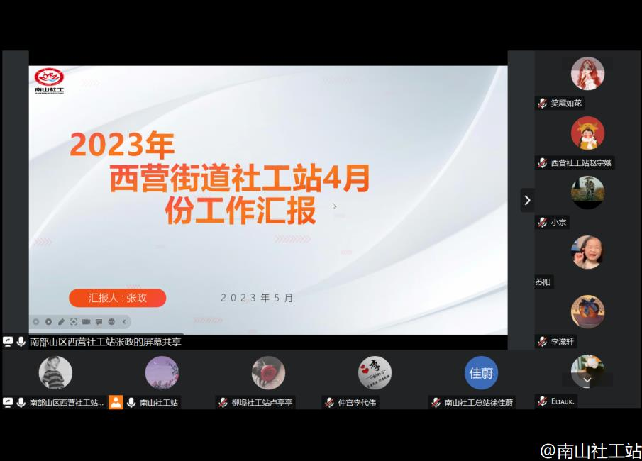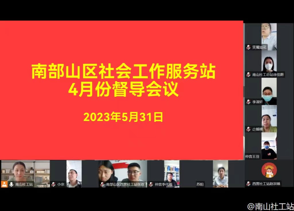 为进一步推进南山社工站规范运营和工作水平的提升,及时发现社工站存在的问题,积极指导社工站工作有序推进。5月 31日,南山社工总站组织召开4月份线上督导会。南山社工站全体社工参加了会议。