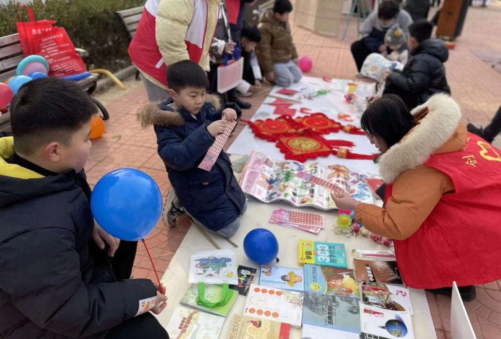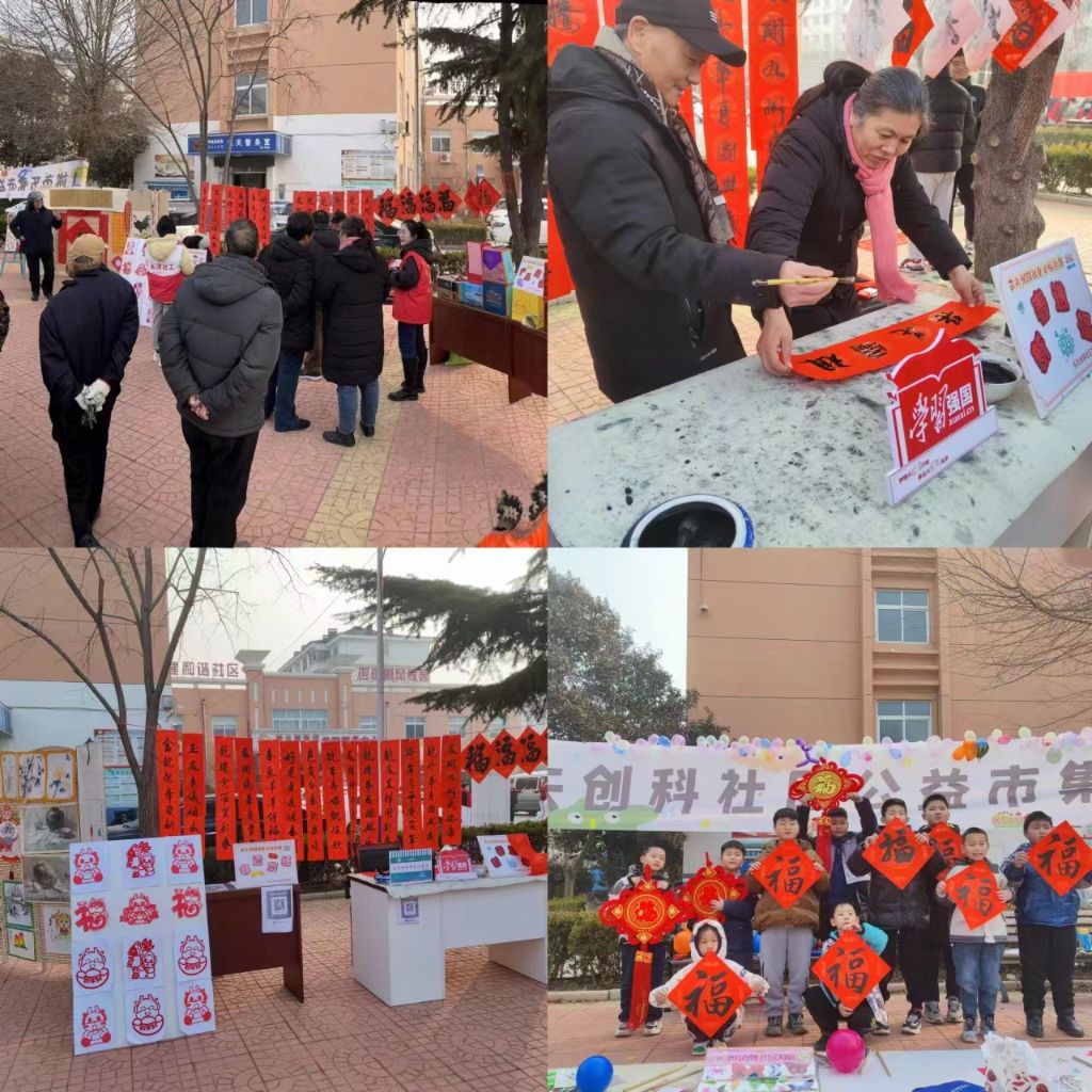 公益集市中设有暖心义诊区、便民服务区、儿童跳蚤市场、儿童架子鼓、创意美术、新春送福、政策解读、非遗剪纸等内容,在寒冷的冬日中也能居民感受到暖意,并积极参与其中。