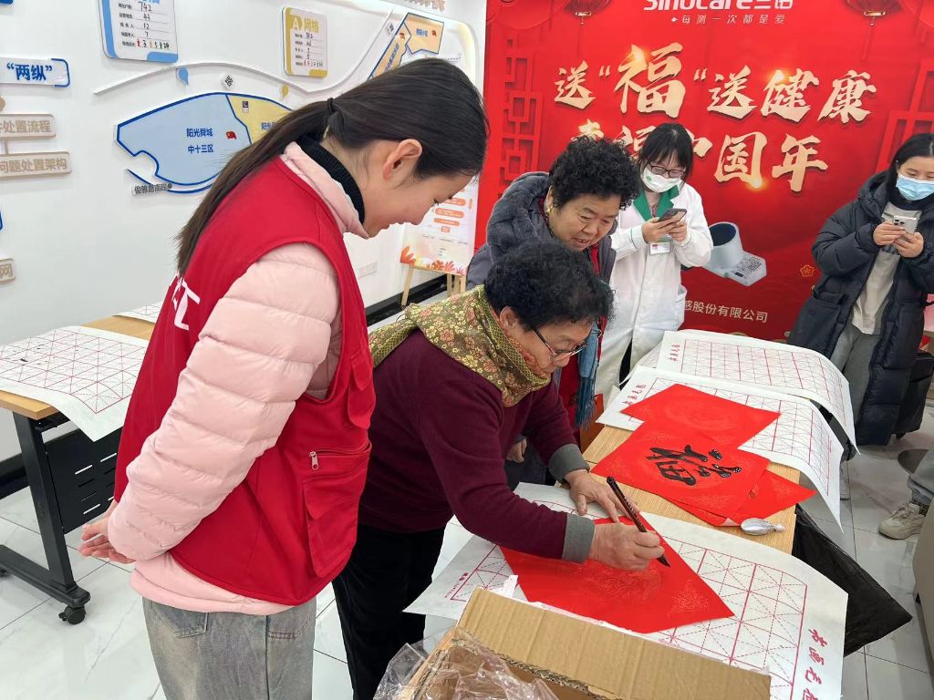 活动前期,社工积极向居民宣传义诊活动的时间和内容,与平嘉大药房对接活动流程,为成功开展义诊活动做好铺垫工作。活动还未开始,社区的叔叔阿姨们就陆陆续续到场了,社工引领大家有序签到并排队入场就坐。活动现场,平嘉大药房工作人员为到场居民提供高血压、糖尿病等方面医疗健康咨询服务,深入地讲解了冬季科学饮食、作息问题,细致地为居民查血糖、测血压。活动尾声,社工组织社区老年志愿者现场写“福”字,一张张饱含真诚的祝“福”赢得了现场居民的阵阵喝彩。