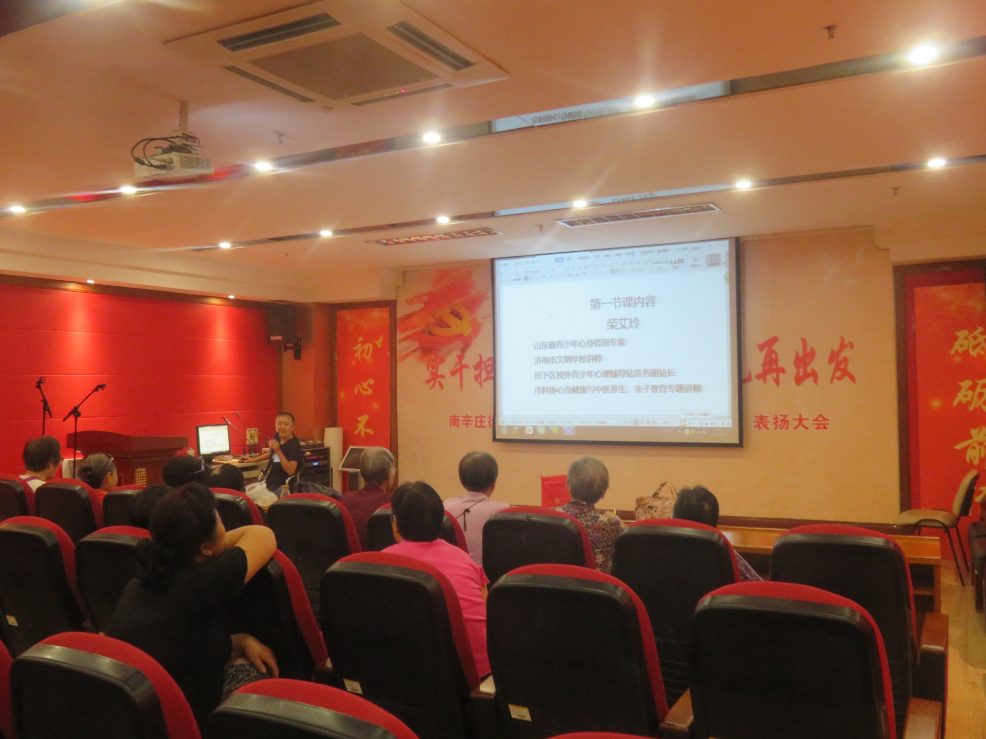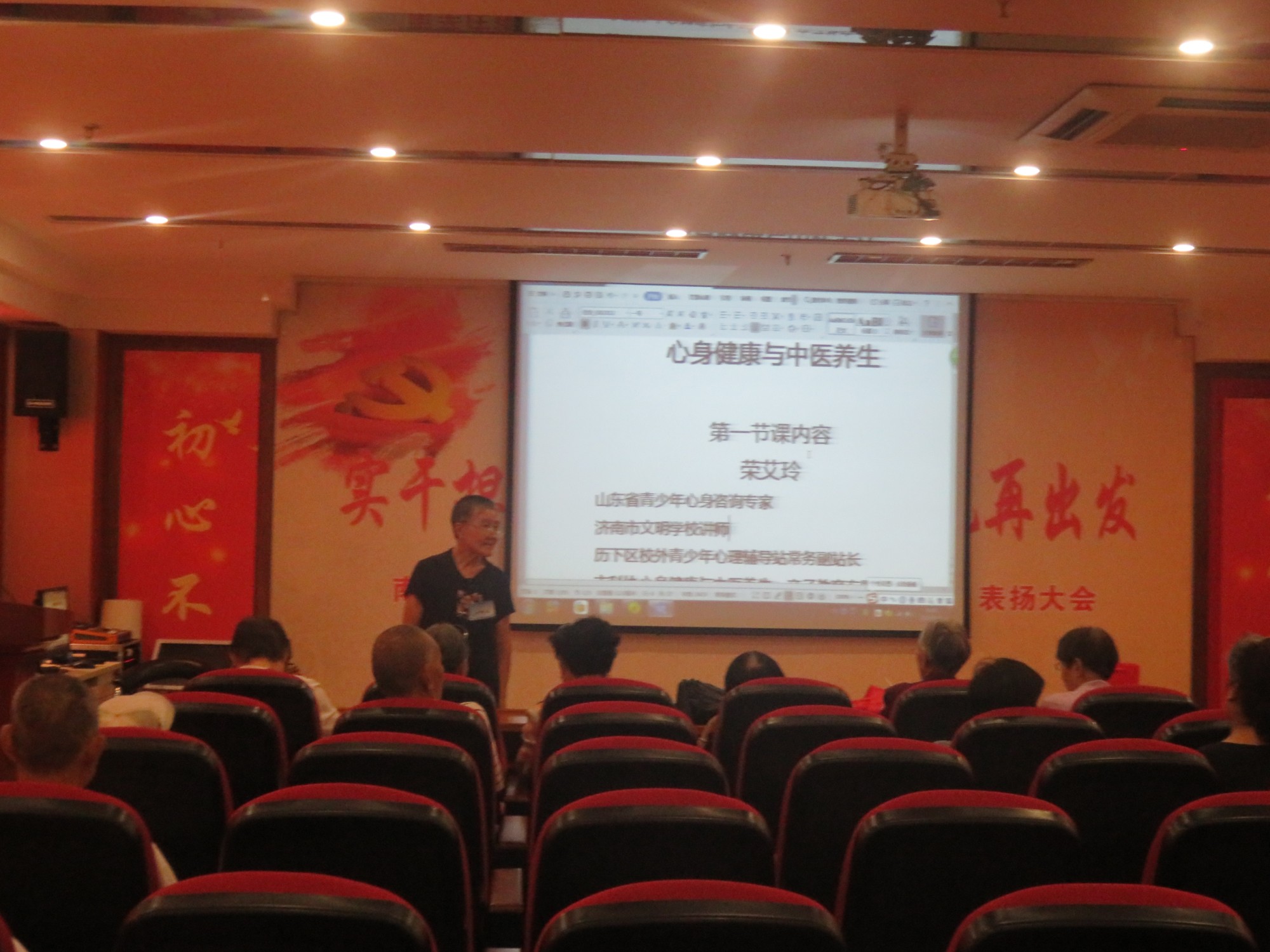 本次健康知识讲座特别聘请荣艾玲老师,荣老师是山东省青少年心身咨询专家、济南市文明学校讲师、历下区校外青少年心理辅导站常务副站长及市科协心身健康与中医养生、亲子教育专题讲师。本次讲座以“心身健康与中医养生”为主题,荣老师将心神健康和中医养生融合在一起,且穿插自己工作中的一些具体案例,使得课堂生动有趣,社区老人听得津津有味,时不时报以阵阵掌声。