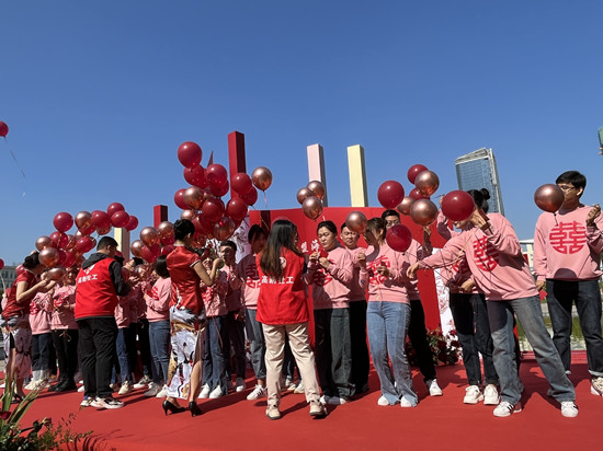 仪式现场,在场领导为新人颁发结婚证书,并致以新婚祝福。社工将象征美好寓意的红色气球交到新人手中,伴随着动听的音乐所有气球升上天空,带着满满爱意启航。活动现场充满了欢乐的氛围,路过的居民自发为12对新人祝贺,纷纷拿出手机记录下这幸福时光。活动结束后,社工帮助新人拍照留念,同时积极介绍社工站,引导他们在有需求时可向社工寻求帮助。