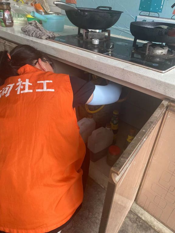 社工小杨和村委成员小王重点查看独居老人煤气罐的安检时间、出产厂家,详细检查了老人家中煤气管软管老化、灶具是否自带熄火装置、燃气阀门是否及时关闭等事项;对在煤气罐周边使用明火的李大爷及时劝阻,提醒老人千万不能麻痹,确保消防安全;在发现特困供养贺大爷家中有燃气胶管老化、管道接口松动的现象后,及时帮助其更换了老化胶管,加固管道接口,确保了贺大爷后期用气安全。