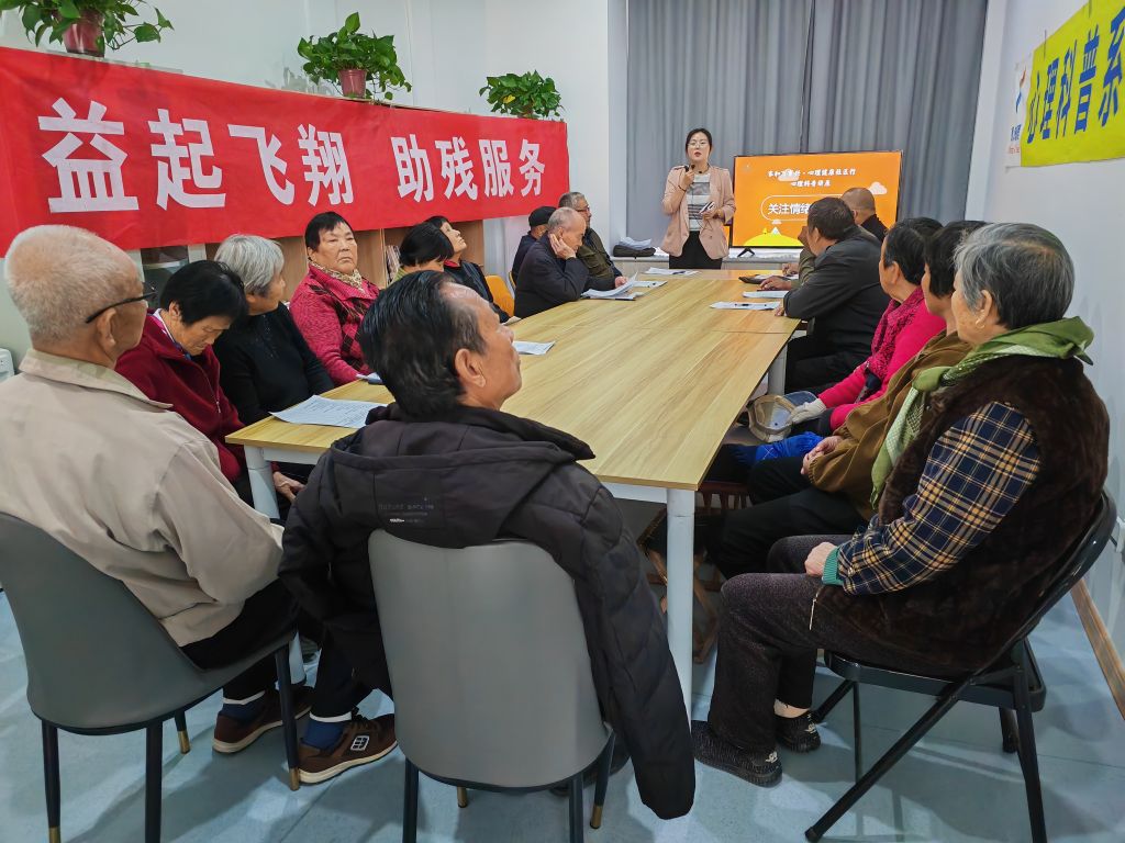 活动邀请观渐心理咨询机构周逸老师做讲座。活动中,街道社工站社工为残障人士及其家属分发信息登记与心理筛查表,主要围绕如何识别抑郁情绪及临床表现、做好自我关爱等话题展开交流。周老师通过PPT讲解、小游戏、案例分析相结合的方式,用浅显易懂的语言为他们传授心理健康知识以及心理疏导的基本方法和技巧,与他们积极互动,解答提出的问题,大家纷纷表示受益匪浅。