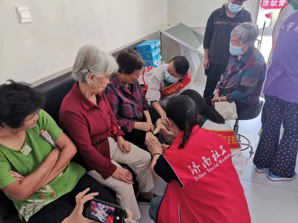 医护人员现场为老人测血糖、量血压、贴膏药、测骨密度,针对每位老人的检查情况提出一对一的建议和专业的就医指导,社工耐心地叮嘱他们日常生活中的注意事项,向他们讲解保健常识,老人们纷纷表示,这样的活动很贴心。