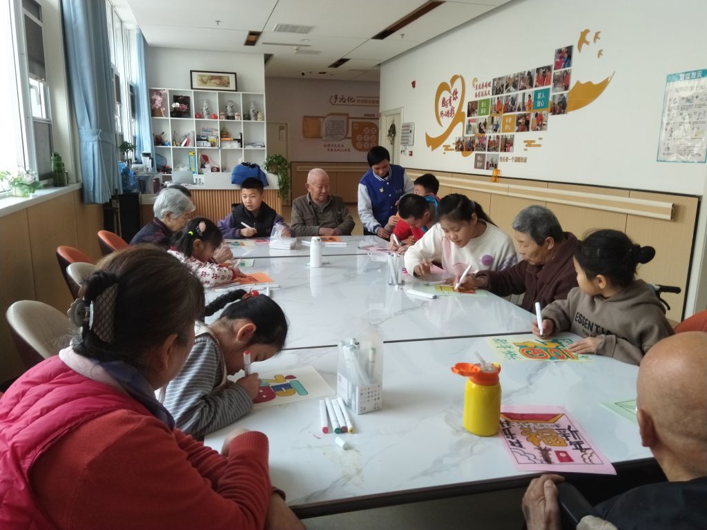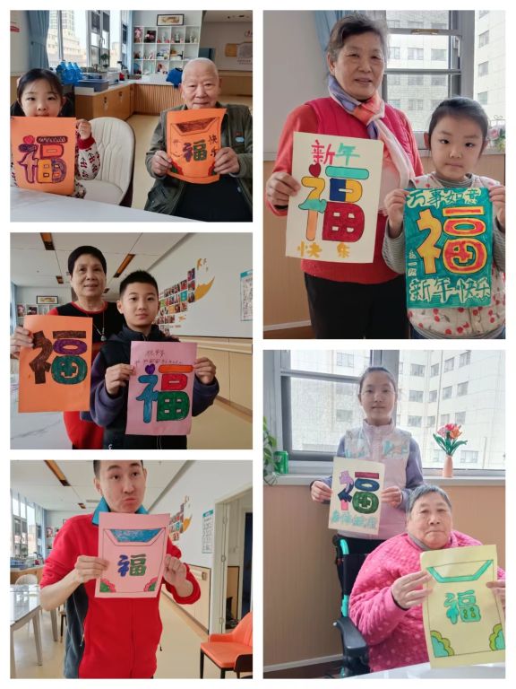 活动在老幼共绘新年美好祝福中开始了,一老一小要结对子齐心协力完成一幅美术作品,有位奶奶只能一只手活动,孩子就帮忙按着纸张。有位爷爷说自己不会画,孩子就化身小老师耐心的教爷爷选颜色涂在相应的位置上。福字绘好后孩子们写上祝福语“祝爷爷奶奶身体健康、新年快乐”,亲手送给爷爷奶奶。老人们全程乐呵呵的,不停的竖起大拇指,夸孩子们聪明、有才,都是好孩子。