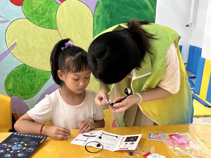 该活动伊始,社工首先向孩子们展示了月相仪的组装方法。在社工的耐心指导下,孩子们动手将一个个零件拼装起来。组装完成后,社工向孩子们介绍了看月相成因的实验原理。社工用通俗易懂的语言解释了月亮如何围绕地球运行以及我们如何观察到不同月相的变化。孩子们听得津津有味,不时发出惊叹声,对科学产生了浓厚的兴趣。通过直观的模型和生动的讲解,孩子们对月相的变化有了初步的认识,理解了月亮在不同阶段的形态变化。