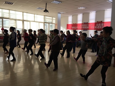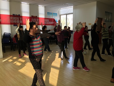 11月4日下午2:30,第三次健身操活动在盛福花园居委会准时开始,简短的小组约定之后,在谢阿姨的带领下,就开始了健身操学习活动。首先是分解动作,向左、向右、向前、向后、弯腰、展开······大家照着样子学起来,认真的样子像个小学生。休息间隙,阿姨们相互聊起了最近在忙什么:哪里的衣服便宜又好看,周末儿子带着小孙子来看自己,给他们做了什么拿手菜等等。接下来,在音乐的伴奏下,阿姨们又练习了刚刚学过的动作。阿姨们说年龄大了,看着简单的几个动作,连续做起来还是记不住。不过就算动作不标准,动动手、动动脚,出点汗,感觉身体还是很舒服的,尤其是到这里和老姐妹聊聊天,心里也高兴。