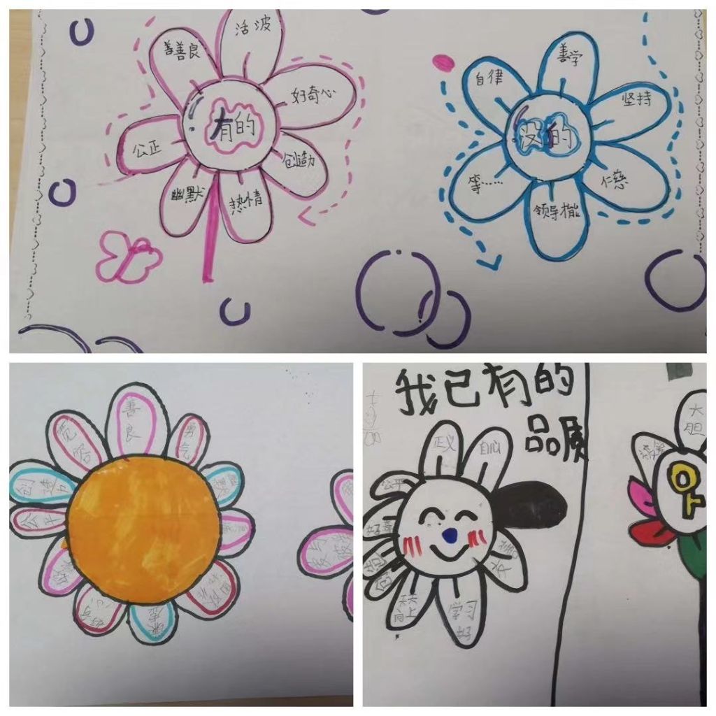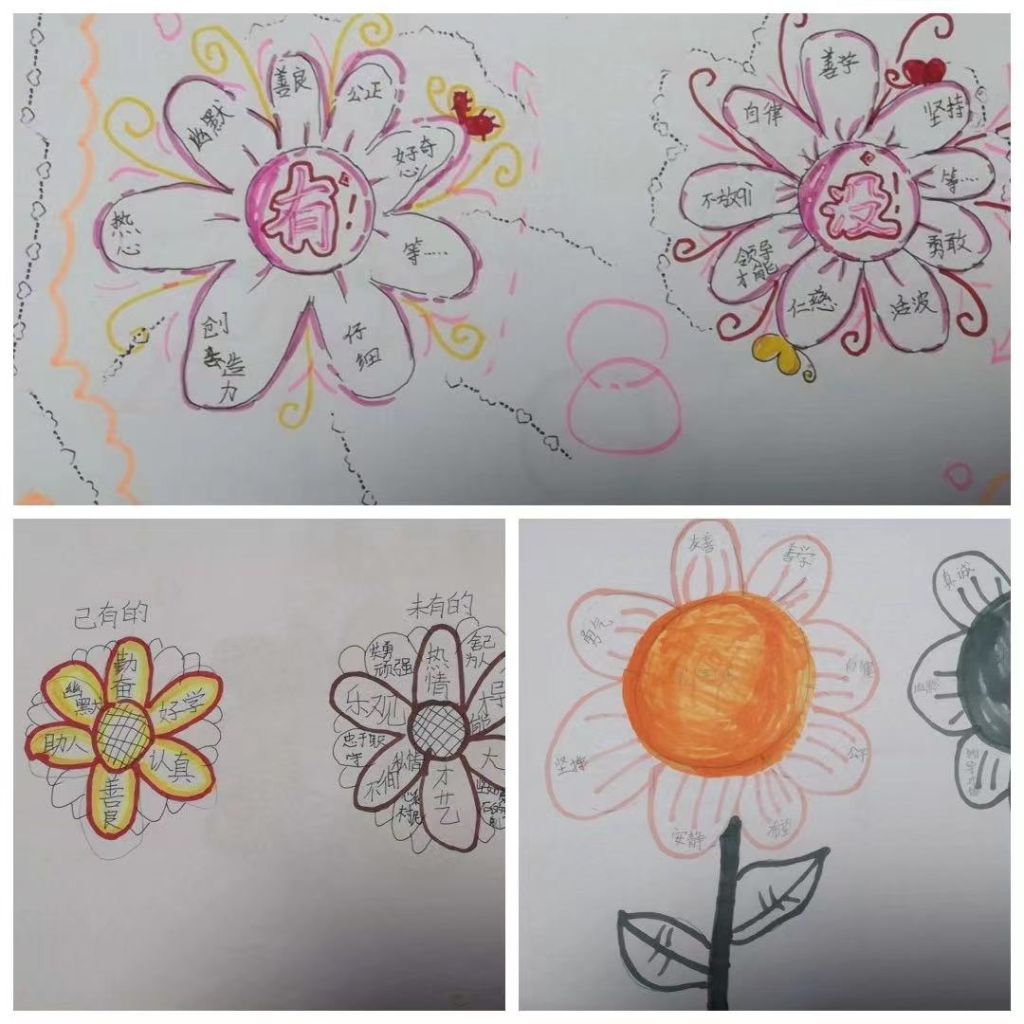 随后,在李秀萍老师的引导下,孩子们用画笔在纸上描绘出两朵花,一朵花代表“我已有的品质”,另一朵代表“我想要拥有的品质”,在每一个花瓣上写下一个积极心理品质,通过绘画引导学生发现自己的积极心理品质,并进行三分钟“王婆卖瓜”式演讲,让孩子们在体验、分享的过程中,把自己的积极品质呈现出来。