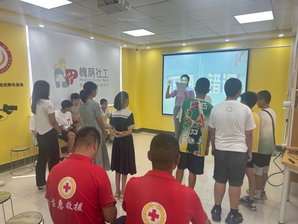 活动主要分为两大板块,一是防溺水知识宣讲,邀请了槐荫区红十字会指导员向青少年及家长讲解了溺水场所、防溺水安全攻略、溺水自救及施救方法等内容,在溺水自救及施救方法的讲解中主要介绍了心肺复苏,施救人员要同步进行30次胸外按压和2次人工呼吸,直至高级生命支持仪器的到达。二是防溺水知识竞赛,共分为三个竞赛环节,第一环节为分组答题,将青少年分为六个小组,组内每位组员分别进行答题,由一名工作人员负责记录青少年的答题正确率并进行积分登记;第二环节为趣味抢答,工作人员读完题目后,青少年进行举手抢答,为最先举手且抢答正确的青少年登记分数;第三环节为判断正误,所有参赛青少年需站在中央,以工作人员的站位为区分线,右边为正确区,左边为错误区,青少年需在十秒内判断题目所述是否正确,并完成站位。