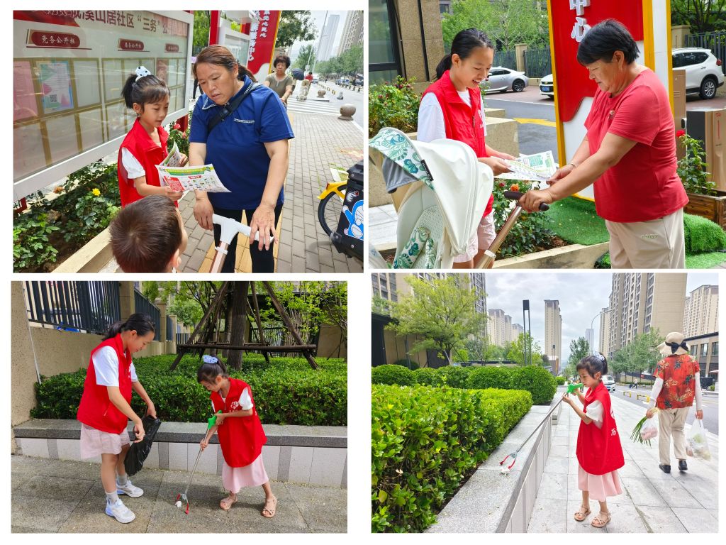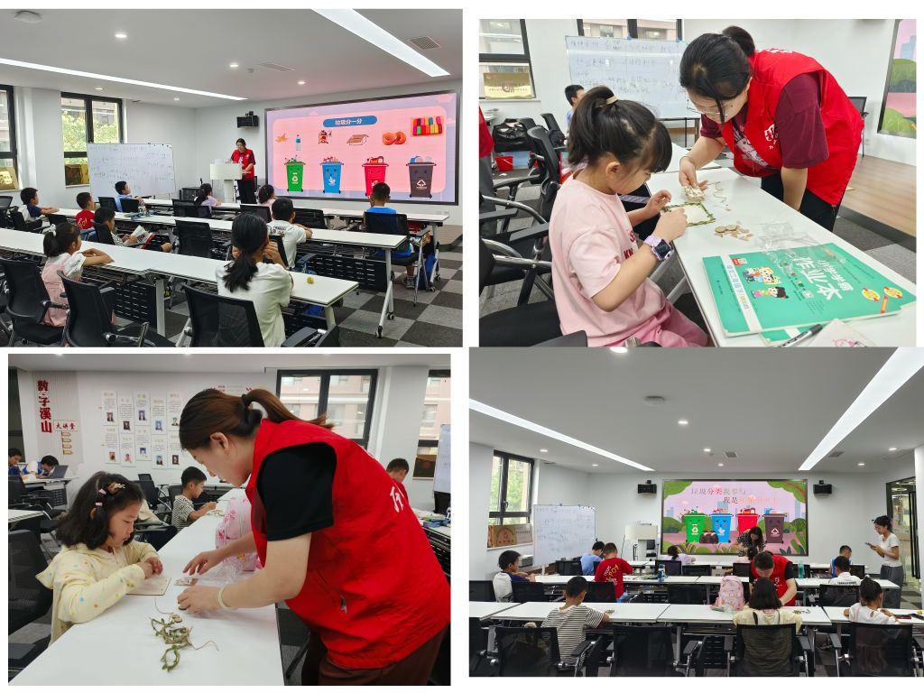 活动中,驻站社工向孩子们详细讲解了什么是垃圾分类、垃圾分类的意义、垃圾如何分类等知识,并通过小游戏,让孩子们化身分类小能手,将不同的垃圾放进不同的垃圾桶内,以寓教于乐的方式加深孩子们对垃圾分类的了解和掌握。随后,社工向孩子们发放了手工材料包,指导并帮助大家制作创意原木画,让儿童在创作过程中加深对生物多样性的理解,感受生态保护的重要性。与此同时,鼓励儿童积极加入环保志愿服务队,争当小小志愿者,并携同加入志愿服务队的孩子切身参与到实践活动中,化身环境治理的践行者,对小区内烟头、塑料袋、纸屑等垃圾进行分类并投放进相应垃圾桶内,同时,为居民发放垃圾分类宣传单页,带动更多居民养成分类投放的好习惯,为美好的家园贡献自己的力量。