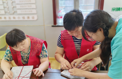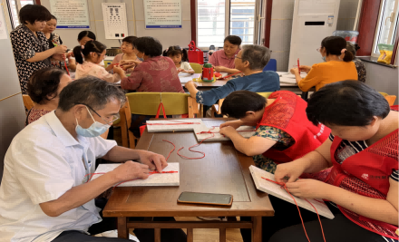“你来了。”小组成员之间互相问好。连续三天的小组活动已经让叔叔阿姨之间建立了友好的成员关系,相见的喜悦之情溢于言表。今天的课程是中国传统非物质文化遗产之一——中国结双向平结的编织,在老师讲述了编绳结的基本手法后,组员纷纷投入到了制作当中。小小的红线牵连着千百年来中华民族古老的智慧,也将青合学院手工班的每一位成员联系在一起。