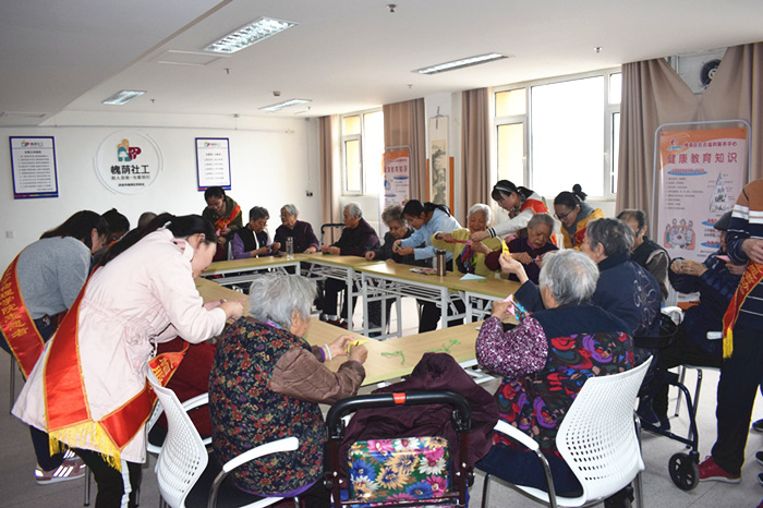 春回大地,万物复苏。为了应景,3月26日下午,众诚悦银龄养老社工项目组借助济南大学志愿者力量为住养老人在福利中心三楼老年大学开展“立体春字剪纸”手工小组活动。
