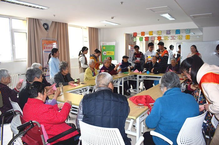 下午三点,济南大学的志愿者们准时到达福利中心活动室,这时也已经有不少的老人也提前到达活动室。等到老人都到齐后,贾奶奶就开始教大家剪“春字”。同时社工安排志愿者分别站在需要帮助的老人身后,此时随着贾奶奶的一声令下,大家开始忙碌起来,有的志愿者跟贾奶奶学一步,再回去教老人一步,如此一来,老人们也都沉的住气了,春字“捺”比较难剪,贾奶奶剪好以后,让社工拿着围着老人转一圈,确认每个老人都完成这一步以后,再进行下一步。在大家齐心协力下,每一位老人都完成了一个春字。还有几个老人剪完以后,不过瘾,还要了几张彩纸,继续剪了起来,旁边的志愿者还教贾奶奶纸玫瑰的折法,贾奶奶很是感兴趣,跟着也学了起来。