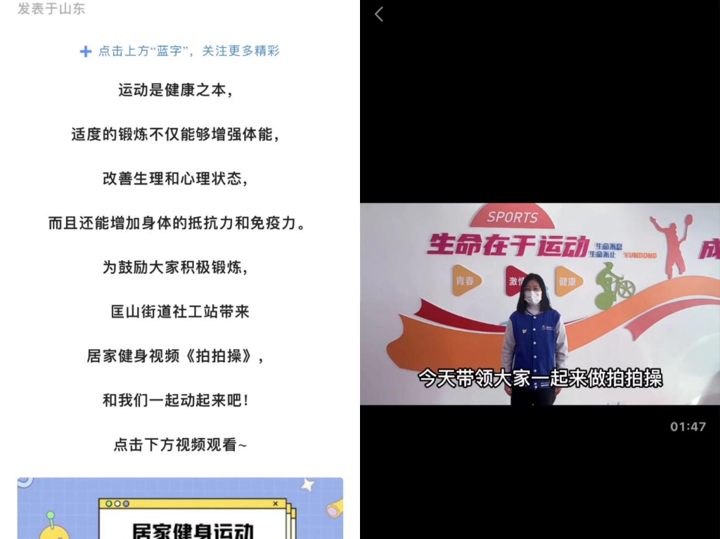 健康的身体是人们生活、工作和学习的基础,居家期间适当的运动有助于提升防病抗病能力,缓解心理压力,减轻焦虑和紧张情绪,提高自身免疫力。为了满足疫情期间居民的健身需求,匡山街道社工站通过微信公众号向居民推荐居家健身运动视频《拍拍操》,因地制宜开展健身活动,协助居民养成主动健康,预防第一的最佳健康生活方式,增强免疫力、达到抵御病毒的目的。