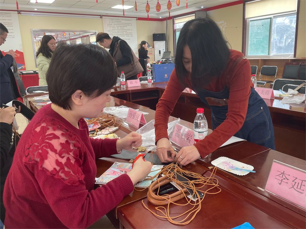 活动开始,社工为居民分发提前准备好的手工材料,随后,社工链接到专业老师带领大家认识材料、了解制作方法,并逐一向居民展示制作的步骤和技巧。社工在一旁指引帮助,大家全神贯注地投入到制作中。在一片欢声笑语中,一个个精美的国潮手工包呈现在眼前,大家互相交流展示自己的成果。居民郑阿姨说到:“天气暖和了,这款手工包出门游玩背上正合适,既美观又轻巧,主要是自己做的更有意义!”
