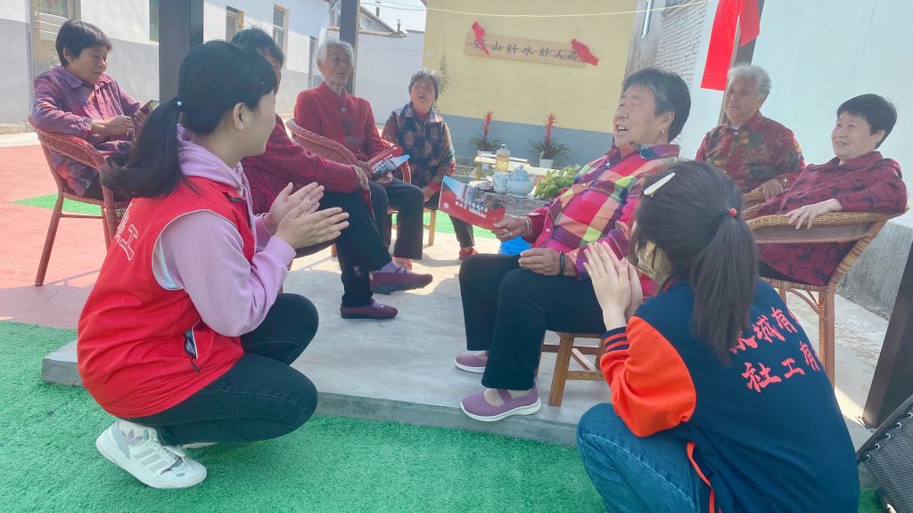 当天上午,社工早早来到贺小庄村幸福大院广场布置摊位,等待参加启动仪式的群众到来。活动现场,社工通过展示展板、发放社工宣传单页、现场交流咨询、开展社工小游戏等方式,以通俗易懂的话语为老人讲解社工站服务内容,并就如何参与社工服务进行细致介绍。社工与幸福大院的老人们围坐在一起倾心交流,耐心细致的询问每一位老人的生活和身体状况,听他们讲在幸福大院里的生活,聊着聊着,老人们纷纷感谢党和政府的好政策,并为社工唱起了经典红歌,赢得了全场人员的热烈掌声。活动临近尾声,78岁的空巢老人张大娘紧紧拉着社工的手,不舍得松开,社工叮嘱老人要注意身体,以后会常来陪伴,如果有需要社工站协助解决的困难就与社工联系。