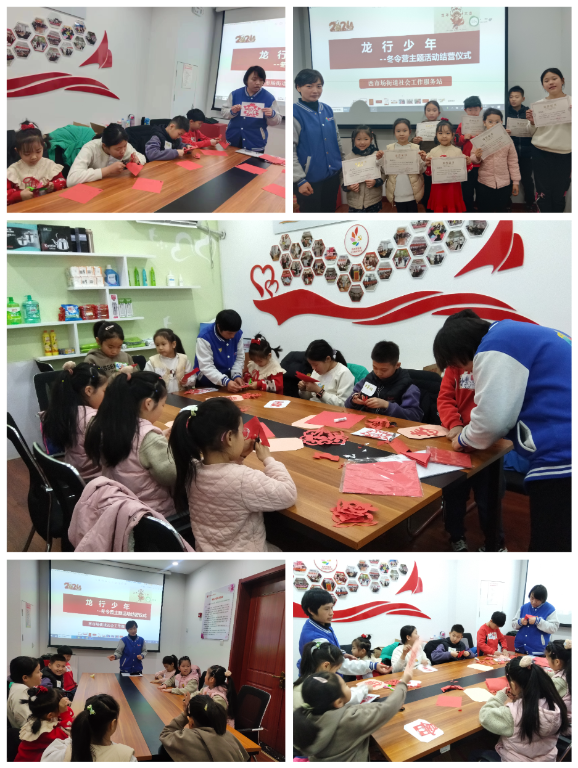 实践活动可以传递爱心,传播文明,有助于建立社会和谐,促进社会进步。对于青少年来说社区实践更是一种难得的学习机会,既能丰富生活体验还能奉献社会,从而形成正确的世界观和价值观。为此冬令营最后一期主题活动--社区实践版块就此诞生。在社工的指引下小营员们开始了自己的创作,三下五除二就人手好几副窗花呈现出来了。然后分组激烈讨论设计送窗花和“福”字的流程和祝福语,社工无不对小营员们的认真态度所折服。跟随社工镜头龙行少年的小营员们开始了他们的“福”满社区行动。“奶奶,过年了,这幅窗花送给您,祝您龙年大吉”最小营员米粒第一个送出自己的祝福。“爷爷,马上过年了,这是我们自己写的福字送给您,祝您身体健康,新年快乐”优秀小营员依依说道,“好好好,小朋友,谢谢,也祝你新年快乐,这字写的太棒了!” 爷爷连连夸赞道。龙行少年的小营员们两三人一组把窗花和福字送给了社区的爷爷、奶奶、叔叔、阿姨,用他们的爱与幸福感染着每一个人,而他们也收获了社区居民的肯定与赞扬。社工站设计的剪窗花送“福”字的社区实践版块旨在锻炼小营员的人际交往能力和发现问题、解决问题的能力,也可以让青少年看到不同的人生、不同的生活方式,和学校课堂以外真实的社区社会生活,有利于提高个人综合能力,同时也为社区的文明建设奉献自己的力量。
