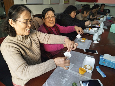 活动开始通过播放视频短片宣传计生知识并进行有奖问答加深印象,接着进行甜点制作提高居民参与兴趣。以甜点制作为推手,有学有玩,劳逸结合,有效提高了居民学习兴致。在制作过程中大家相互咨询,合作帮忙,不时自己的想法融合到作品中,最终顺利地把“爱心”包制完成。