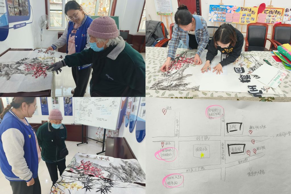 在“潮生活”智能手机小组中,社工为小组成员讲授了如何足不出户,便可线上预约挂号。小组成员想着不能只有他们学会了方法,如何将附近的医院、诊所、药店为大家展示出来,方便辖区居民寻找。于是小组成员运用在手机小组学到的高德地图的使用方法,以绿园社区为中心向半径5公里内查找医院、药店等地,由社工执笔,齐心协力绘制了地图初稿。在后期志愿者金阿姨与济南大学志愿者协作将初稿美化加工,结合预防流感小妙招,绘制出本次的“健康暖冬”便民服务板报。