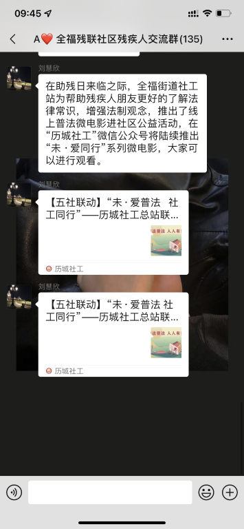 全福街道社工在街道残疾人交流群中分享了普法微电影“未·爱同行”第一期、第二期,意在增加残疾人居民的法律常识,增强法制观念,倡导大家做知法、懂法、护法,守法的好公民。