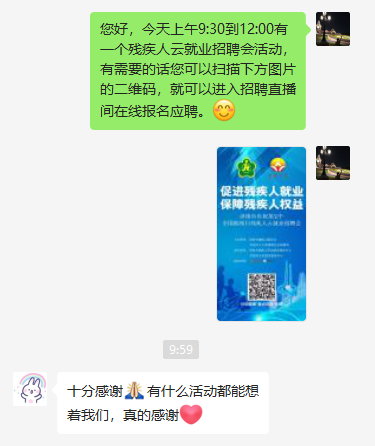 除了向居民普法,全福街道社工还积极贯彻落实“残疾人就业宣传年”和残疾人就业三年行动方案精神,邀请有就业需求的残疾人居民参与线上云就业招聘会活动,积极推动残疾人高校毕业生及未就业残疾人实现就业再就业。