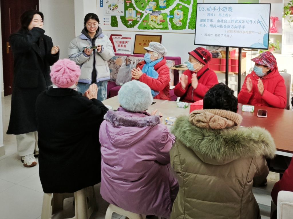 相识相知,让心更近。在活动开始之际,社工与服务对象进行了一个破冰小游戏“一起猜歌名”,服务对象积极参与其中,最后一起合唱了革命红歌。在轻松愉快的氛围下,社工与服务对象开始进行了一个相互的简单自我介绍。“各位奶奶好!我的名字叫……”社工清脆的声音像一缕寒冬暖阳从活动场地传出。在社工的带动下,服务对象也开始介绍起了自己。通过相互介绍自己的姓名和爱好,大家开始相互了解,彼此的心也渐渐贴近。