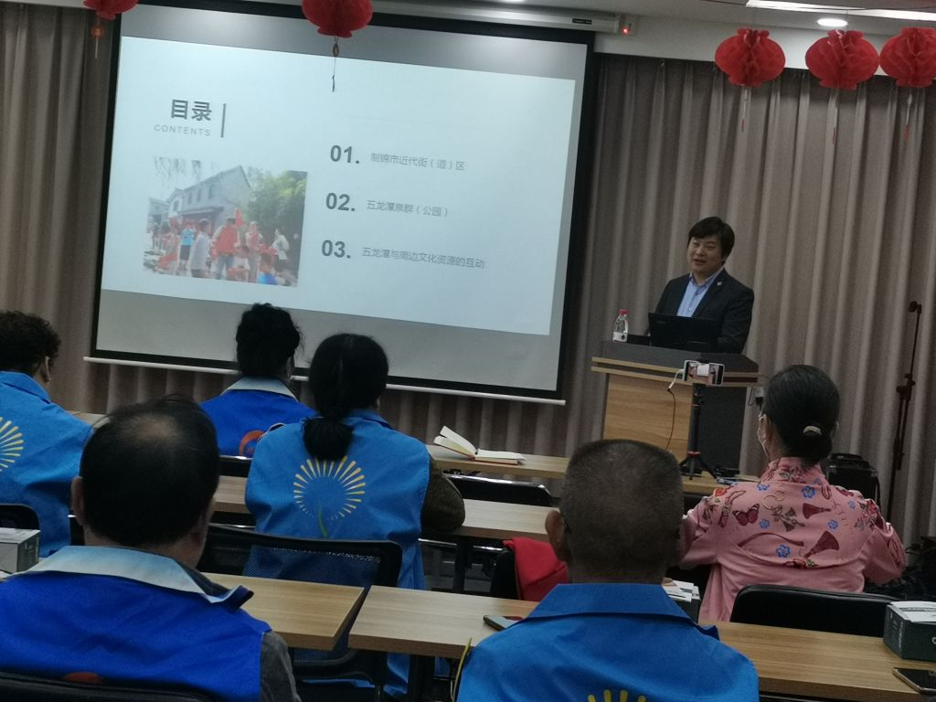 为丰富社区老年人业余生活,动员老年人参与到社会事务中散发“余热”,有效推动“银杏驿站”老年人服务项目中志愿队伍打造的实施, 近日,制锦市街道社工站邀请济南市金牌导游朱老师来到社区,为社区老年人讲解制锦市的由来和人文轶事。