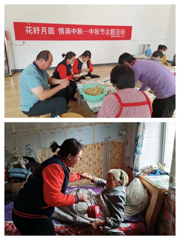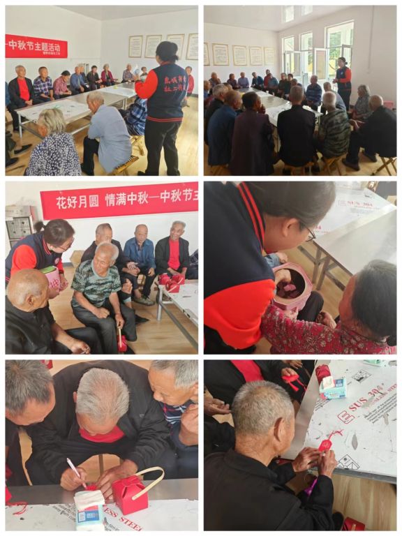 社工站到达活动现场后,开始布置横幅,将月饼及礼品摆放妥当,随后与幸福院的志愿者们一同包水饺,煮水饺,让老人们到达幸福院后吃上热腾腾的午餐。同时,社工协助村委成员一同将月饼礼盒及水饺送到行动不便的老年人家中,让他们也能够感受到中秋节的氛围。