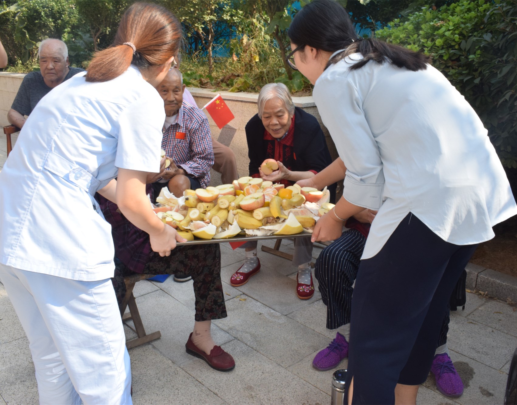9月30日上午9点,住养老人们按时到达了约定地点。现场一片红色飘扬,在欢声笑语中,贾奶奶、赵奶奶、刘奶奶和丁爷爷以一首激昂的《中国,中国,鲜红的太阳永不落》为今天的活动拉开序幕。活动间歇,工作人员贴心地为老人们提供了水果。接下来,有才艺的老人们依次登场,为祖国母亲献上自己的祝福。刘云仙老人带来的《唱支山歌给党听》婉转动人、方春荣老人以嘹亮的歌喉演唱了一曲《今天是你的生日》等等。节目不见得多么精彩,但是它代表着老人们一片赤子之心。