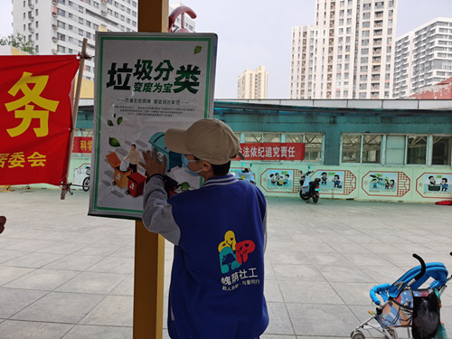 为推行社区生活垃圾分类工作,社区设置了专门的生活垃圾投放点,社工为社区居民详细讲解了投放箱的使用方法。活动现场,发挥“文明宣传小分队”的作用,在社区广场进行垃圾分类知识的普及。社工通过通过悬挂宣传板、发放宣传手册等方式,详细的向社区居民介绍了垃圾分类的重要性、分类方法、资源回收利用、废弃物处置等知识,现场指导社区居民如何将垃圾正确投放到对应的垃圾桶里。