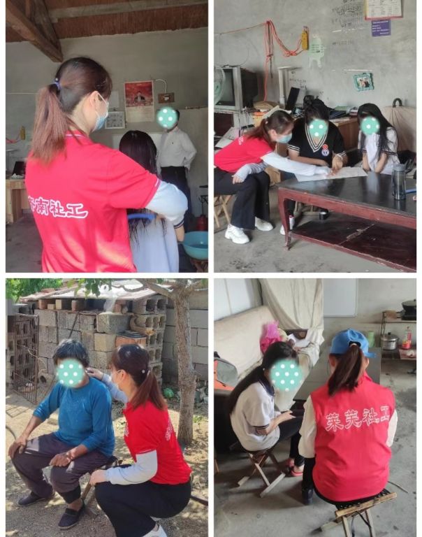 初来到孩子的屋内,由于人数较多,孩子有些怕生,一直在里屋不愿出来,于是社工们与帮扶中心的志愿者们决定分工合作,由于孩子刚刚洗了头,户外有风,怕孩子受凉,一名社工与志愿者为孩子擦头发,吹头发,并为孩子修理额头前的刘海,将仪容整理妥当后,社工与志愿者又为孩子辅导了家庭作业,随后一同到户外聊天、做游戏,孩子的脸上也逐渐露出了灿烂的笑容。与此同时,另一名社工在跟家中的老人了解家中的情况,孩子父母的情况,并做好相关记录。