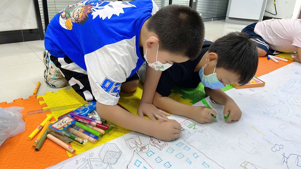 儿童是国家的希望和未来,是社会发展进步的基础,只有拥有健康的体魄,才能做合格的社会主义接班人。伴随轻快的音乐节奏,社工带领儿童进行“拍拍操”热身运动,体验运动乐趣、打破儿童陌生感。接下来,社工向儿童科普儿童友好社区含义以及如何构建友好型社区,鼓励儿童从自身视角绘制理想社区草图,引导儿童从游乐设施、社区环境、住房建筑等方面拓展思维、激发创意。“小志愿者”大显身手、不负众望,充分发挥想象力和创造力,在长达十米的画纸上创作出了一幅幅生动活泼的作品,表达着内心对友好社区的美好憧憬与向往。