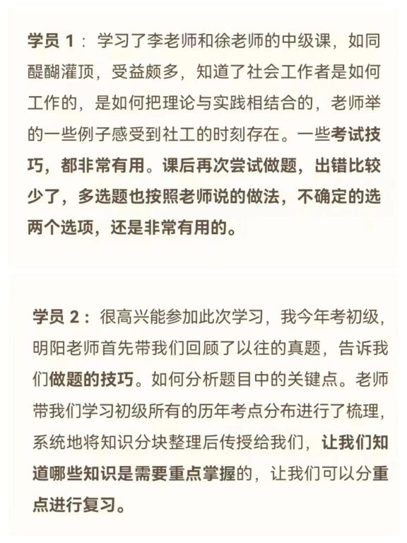 本次培训班课程由来自济南基爱社会工作服务中心总干事李明叶、副总干事徐菲菲、王明阳等社工专业院校社会工作背景的领域专家和资深人士,授课课程分别为初级《实务》及《综合能力》和中级《实务》《综合能力》及《法规与政策》。老师们围绕考试大纲准确把握考试复习的重难点,总结考试规律,梳理考试内容,结合丰富的真题案例讲授应试技巧,大大帮助考生理清教材脉络、有效掌握社会工作专业知识,极大地提高了复习的效率,增强应试能力。