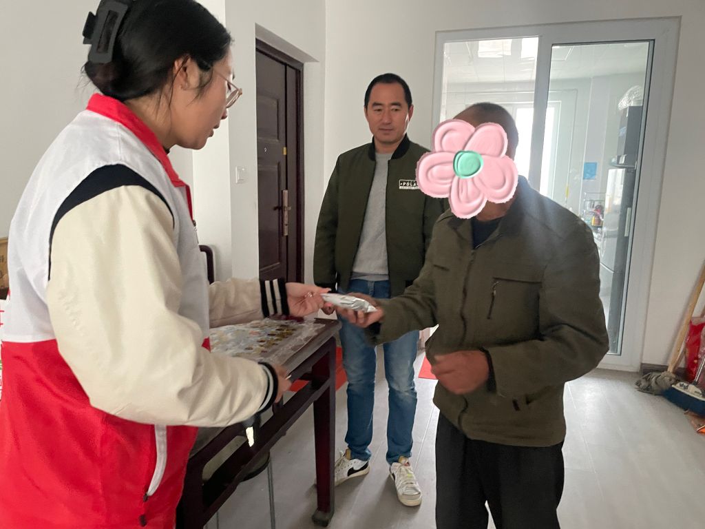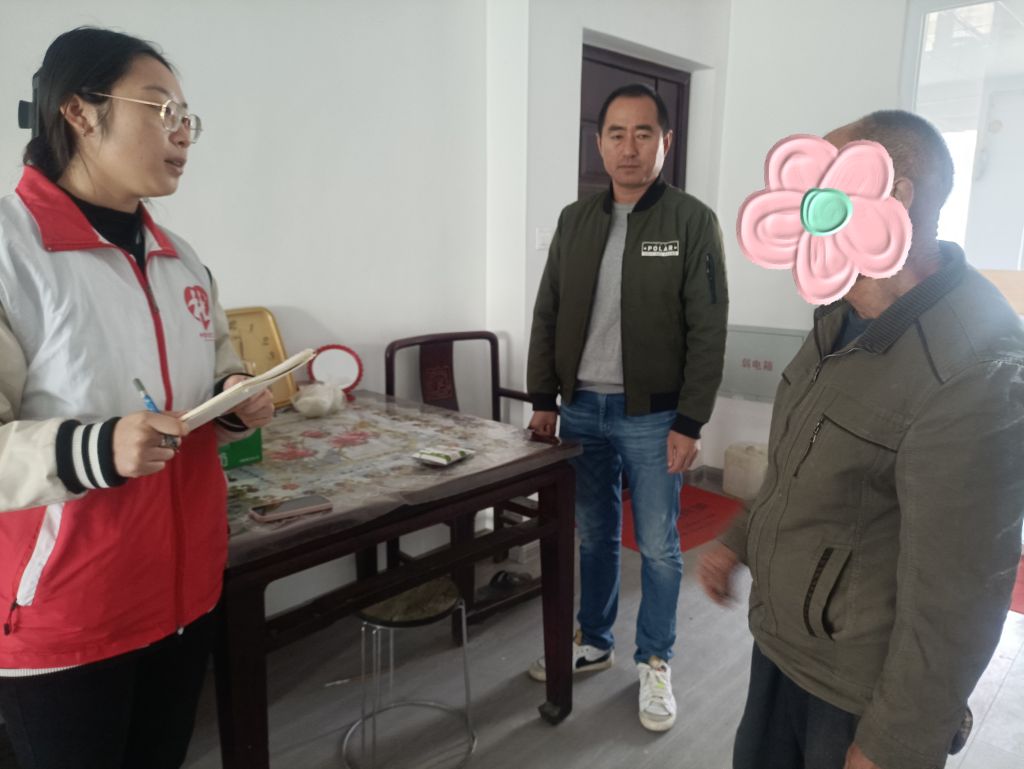 由于案主没有通讯设备,社工提前与村书记沟通好时间,为案主提供服务。轻轻扣响案主的门,案主虽然有些紧张,但已经与社工见过一次,还算较为放松。一进门社工便亲切的与案主打招呼,向案主介绍自己,扩大社会工作的认知度。社工将自己手中的牛奶递给案主,案主虽惊讶但是又欣喜,社工告诉案主每周都会前来探望,案主说道“每周都来,家里就我自己一个人,那有人陪我一块聊聊天了”。天气见凉,社工提醒老人及时增添衣物,做好防寒保暖工作。