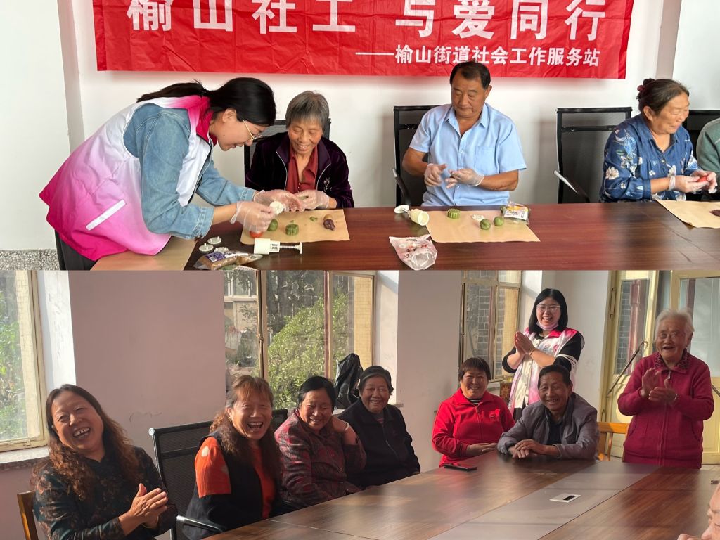本次老年人小组活动,榆山社工站安排了“老年人心理健康讲座”、“情暖夕阳 爱在身边”主题插花活动、“情暖中秋 欢度国庆”手工制作月饼活动、“我游戏 我健康 我活力”老年趣味运动会活动及“品清幽茶香”茶话会活动。通过互动模式促使老年人们在小组这个共同体中相互依赖得到自我认可,缩小自身和社会的距离,获得来自社会网络的支持,共同挖掘潜能,增强自信心。