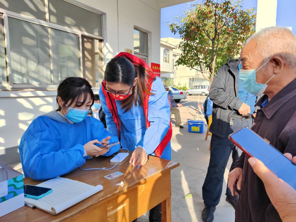 2022年10月9日,张家洼街道社工站的社工们前往曹东村开展了“我们的爱永不止步”-为爱护航,喘息服务,协助在疫情防控中冲锋在前、日夜忙碌的网格员,为一千五百多名村民进行核酸检测的系统录入。