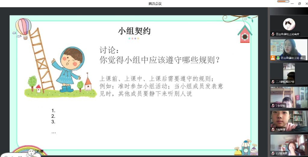 寒假到来之际,为丰富辖区内青少年假期生活,促进青少年多元成长,匡山街道社工站开展“成长N次方”青少年多元成长训练营。1月9日上午,小组成员们相约腾讯会议,正式开启以“你我初相识”为主题的冬令营开营仪式。