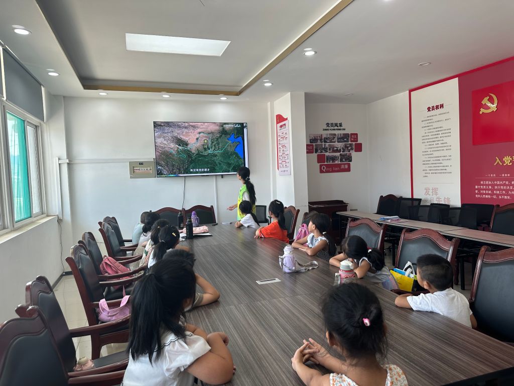 如雄鸡般昂立的中国地图上,蜿蜒曲折的黄河似千军万马咆哮而过,就着那“黄河之水天上来,奔流到海不复回”的魄势,社工向小朋友们展示了黄河的源头和流经地,小朋友们都聚精会神地听着,似乎被黄河的磅礴气势所震撼。随后,社工引导小朋友们在黄河边上找到了家的位置,并强调了家的概念,从而增强小朋友们对家园的归属感与认同感。