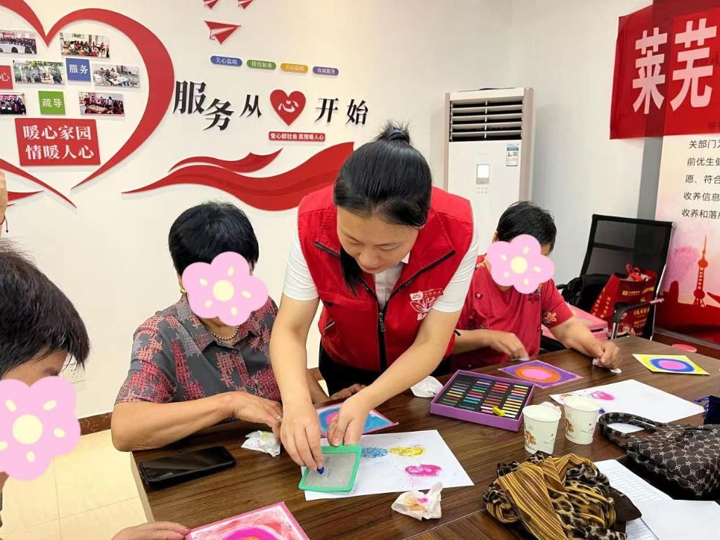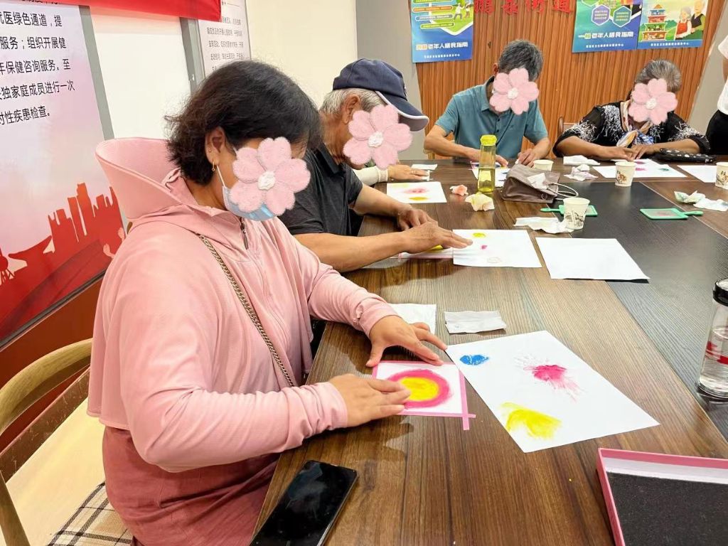 本次活动邀请到心理专家,对他们进行集体心理辅导。在心灵图画环节,社工帮助老人们贴好图画纸,耐心的把老人挑好的彩色粉笔研磨成粉末,老人们在心理专家的带领下完成图画。接下来心理专家带领老人们玩放松游戏,拍打身体部位,舒缓老人积压的情绪,大家身心得到放松,脸上洋溢着开心的笑容。老人们亲切的与社工交谈,通过接触了解到老人的情况,社工运用接纳和理解的技巧,引导他们树立信心,看到生活的希冀。