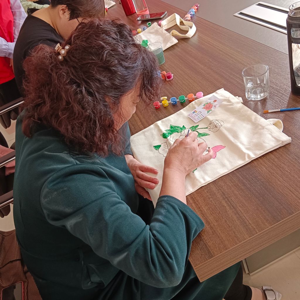 活动开始前,社工用“抢杯子”的小游戏让现场气氛迅速变得轻松热闹起来,大家的互动,瞬间拉近老年人间的距离。然后,社工给老年人们介绍手绘创作所需的颜料、画笔、帆布包,解说绘画的基本技巧、上色要领和彩绘注意事项等。带领大家调配颜料、构图、上色。老年人们围坐在桌子前充分发挥想象力、创作力,经过妙手彩绘一只只图案各异、绚丽多彩的帆布包展现在大家面前,又美观又实用。老年人们欣赏着自己亲手绘制的麻布包,获得满满的成就感,大家互相交流点评,欢声笑语,其乐融融。